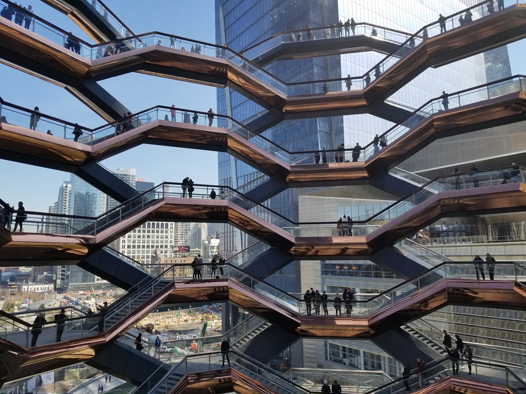 Vessel은 허드슨 야드 공원에 위치한 벌집 모양의 구조물입니다. 저는 신석기 빗살무늬 토기 모양 같던데요. 영국 출신 디자이너 Thomas Heatherwick의 작품입니다. 건축분야 문외한인 저인데도 이름이 낯설지 않아서 찾아봤더니 빙글빙글 도는 의자, Spun Seat (https://youtu.be/ODAshlzJ78Q)을 만든 디자이너더군요.
